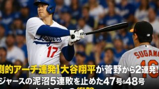 ホームラン 【劇的アーチ連発】大谷翔平が菅野から2連発!ドジャースの泥沼5連敗を止めた47号&48号ホームランの衝撃 ドジャースの連敗を止めるべく、大谷翔平選手が日本の至宝・菅野智之投手から2打席連続ホームランを放ち、チームを勝利へと導いた。 2025.09.08 ホームラン試合