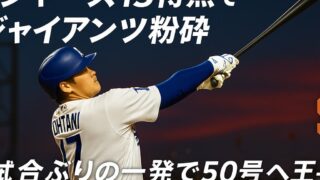 ホームラン 大谷翔平が放った「伝説の52号」!ドジャースをポストシーズンへと導いた渾身の一撃 ドジャースのポストシーズン進出がかかる重要な一戦。大谷翔平選手が放った劇的な逆転3ランが、チームを勝利へ導きました。本塁打王争いでもトップに並ぶ52号の一発は、まさに歴史に残る一打となりました。 2025.09.20 ホームラン試合