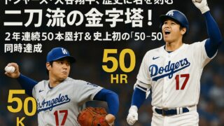 ホームラン 大谷翔平、 2年連続50本塁打&史上初の「50-50」同時達成で二刀流史に名を残す! 大谷翔平が2年連続50本塁打と史上初の「50本塁打・50奪三振」を同時に達成。投手として5回無安打の快投も、救援陣が崩れ勝利は逃した。 2025.09.17 ホームラン記録試合