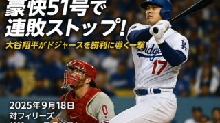 ホームラン 豪快51号で連敗ストップ! 大谷翔平がドジャースを勝利に導く一撃 ドジャースタジアムで行われたフィリーズ戦、大谷翔平が豪快な51号ソロを放ち、チームの連敗をストップさせた。先発ブレイク・スネルの好投を援護する一発が、ドジャースに貴重な勝利をもたらした。 2025.09.18 ホームラン試合